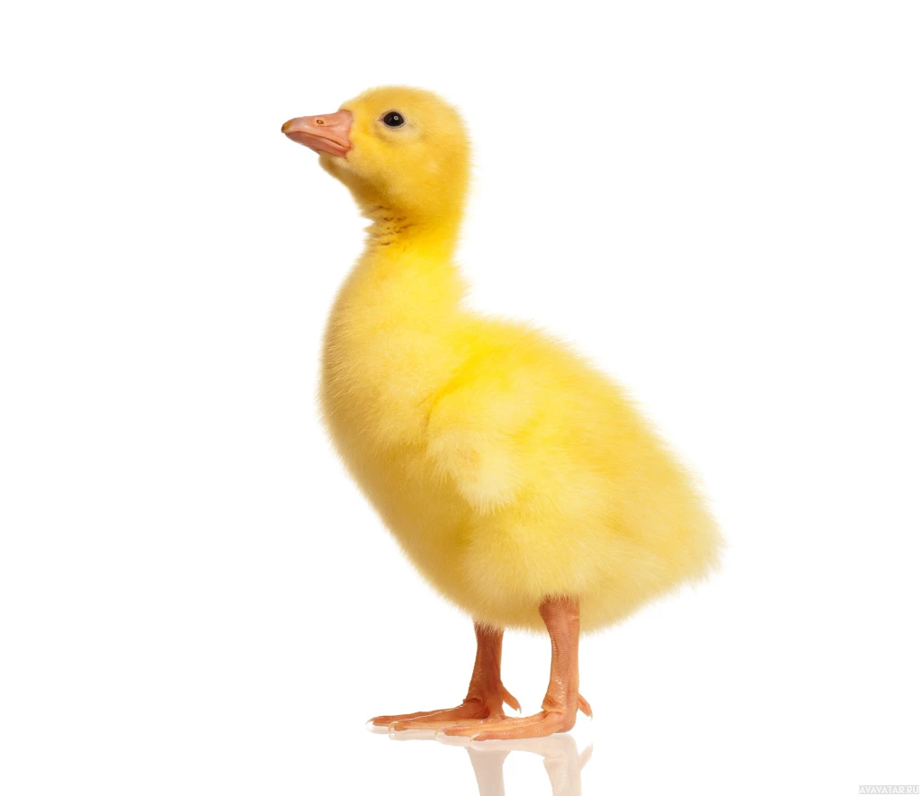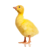 a young bird. It appears to be a golden or yellow color, and it's standing upright on one leg with its head turned upwards as if looking at something above. The background is plain and white, providing no distractions from the subject of the photograph, which is the duckling.