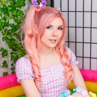 pink hair styled into two ponytails on either side of the head, and they are wearing a purple and white outfit that resembles a school uniform, which includes stockings. They have
