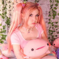 pink hair styled into twin tails and is wearing a pink outfit that could be part of a costume. There are also other objects in the background that suggest