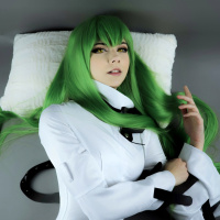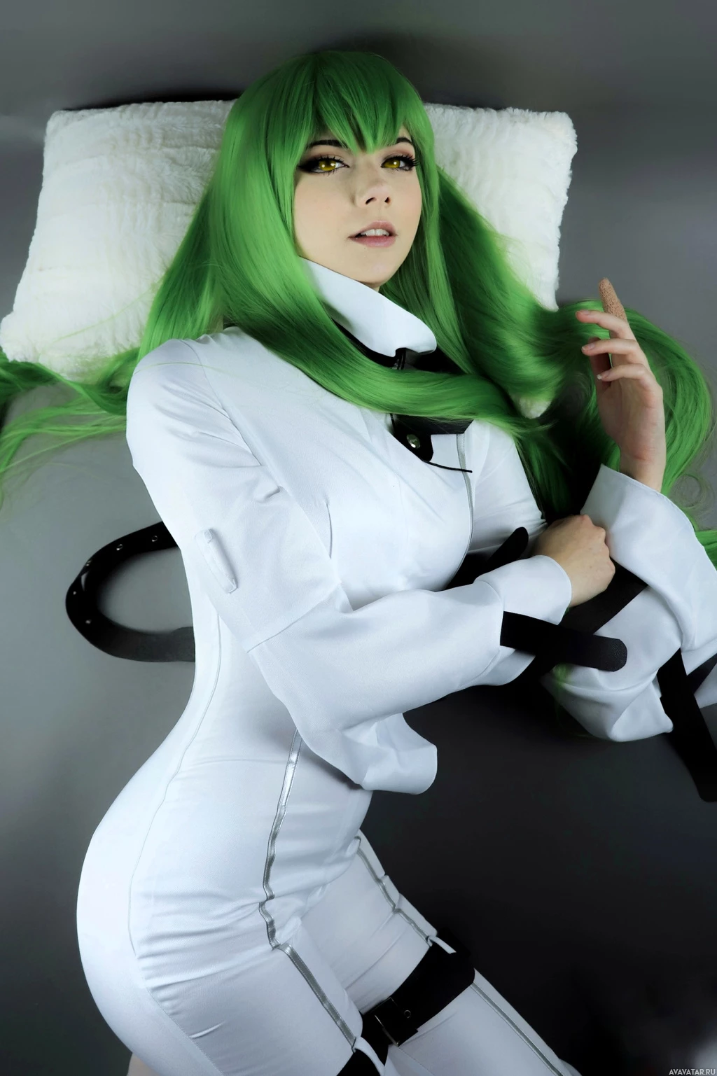 green hair, wearing a white costume or bodysuit. They are posing in a way that could suggest a dramatic or heroic character, perhaps from a video game, movie, or performance piece. The setting appears to be