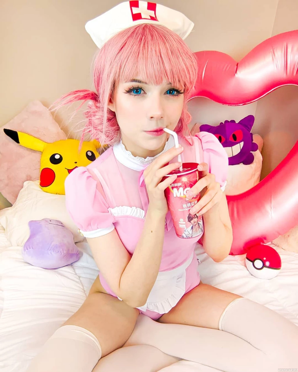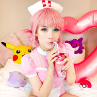 pink hair styled in pigtails. They are wearing a nurse's uniform and sitting on a bed adorned with various items, including Pokémon-themed
