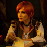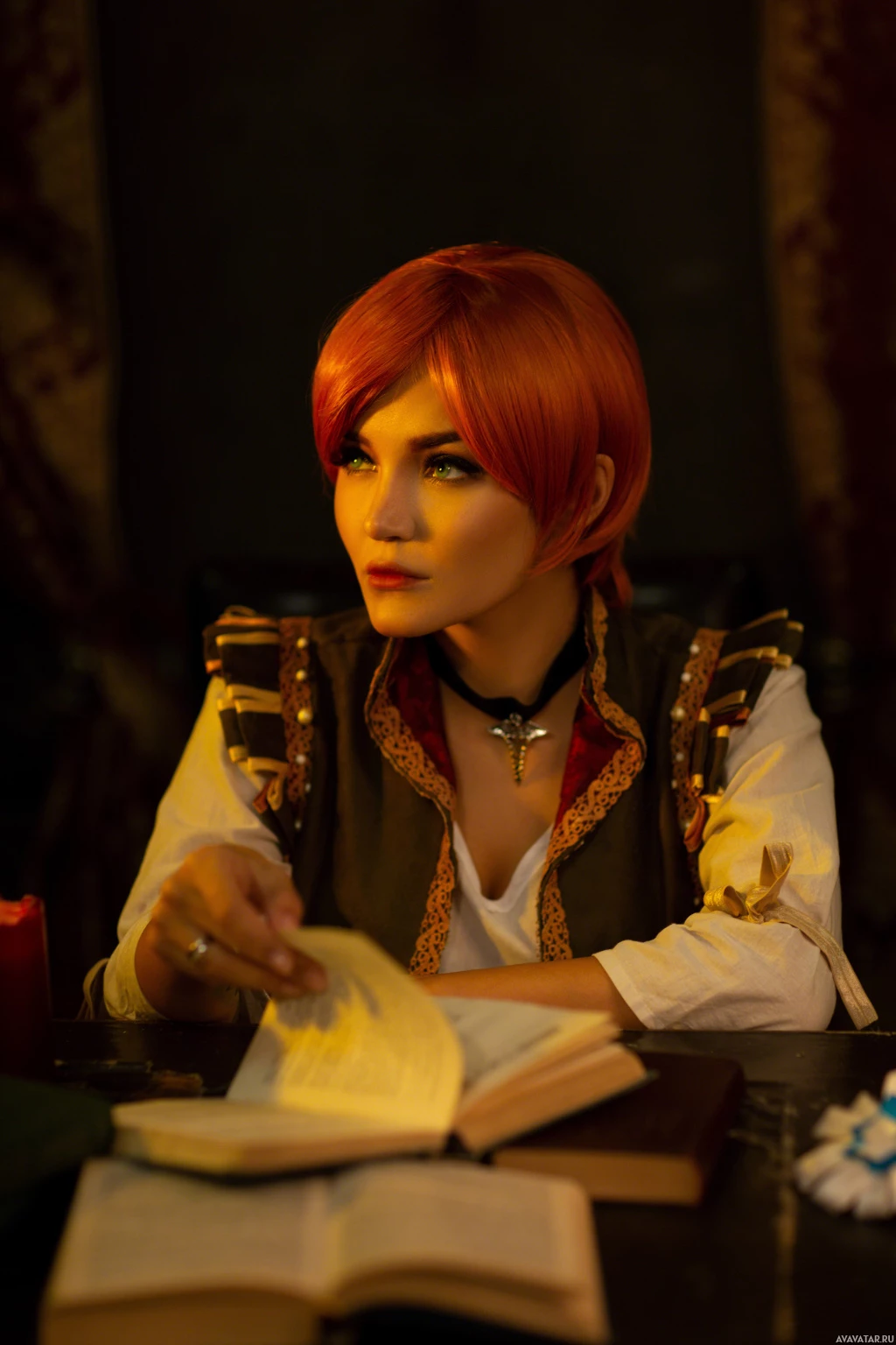 In the picture, there is a person cosplaying as Shani from "The Witcher" series. The individual is wearing a costume that resembles the attire of the character Shani, which consists of an elaborate vest and hat with details that suggest