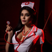The image shows a person dressed in a nurse's uniform, complete with a cap and stethoscope. They are posing for the photo with a confident or seductive expression. The lighting is dramatic, with