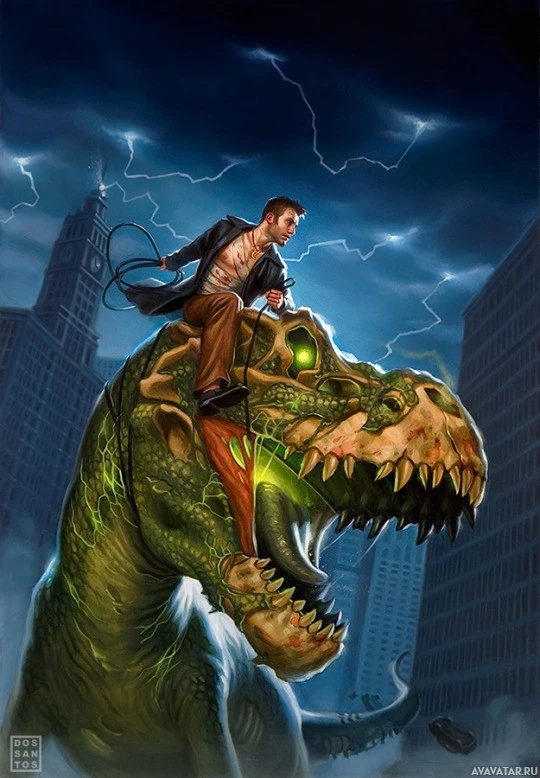 an urban environment at night, given the presence of city buildings and lighting. The character on the dinosaur is dressed in
