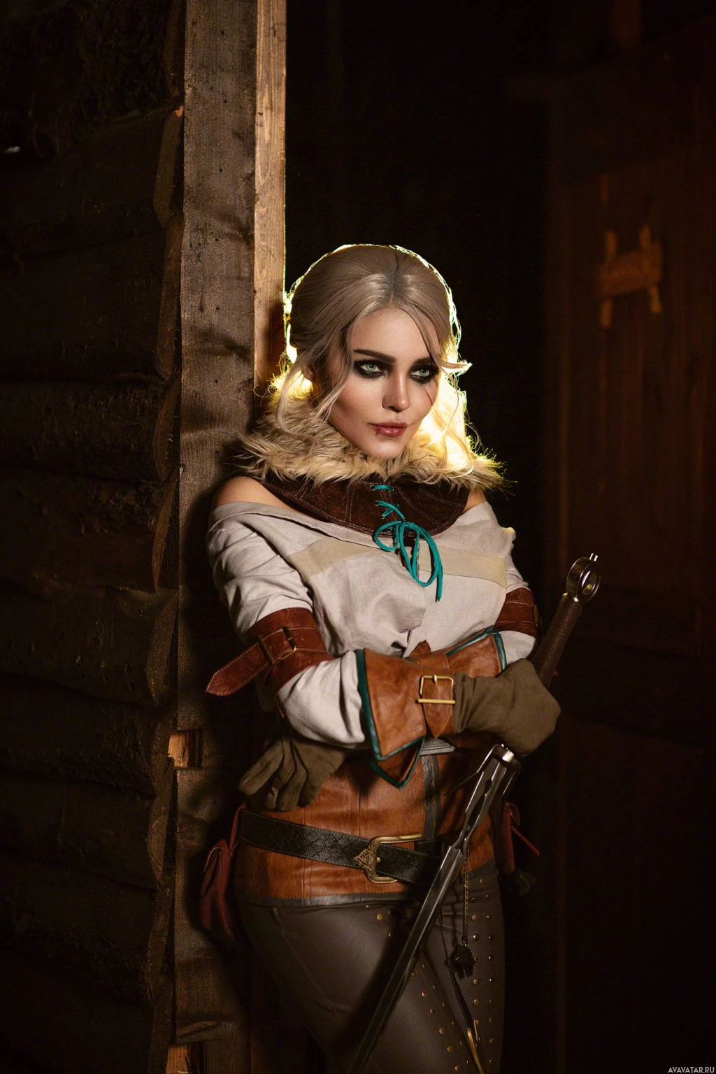 The image features a person cosplaying as the character Ciri from "The Witcher"