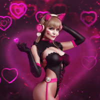 a female character dressed in a cosplay outfit that resembles a robotic or armored look, with pink and black accents. She is wearing cat-like ears on her head and has an accessory shaped like a heart in her hand. The background consists of a gradient from dark to light pink with additional smaller hearts scattered around her, creating a playful and vibrant atmosphere.