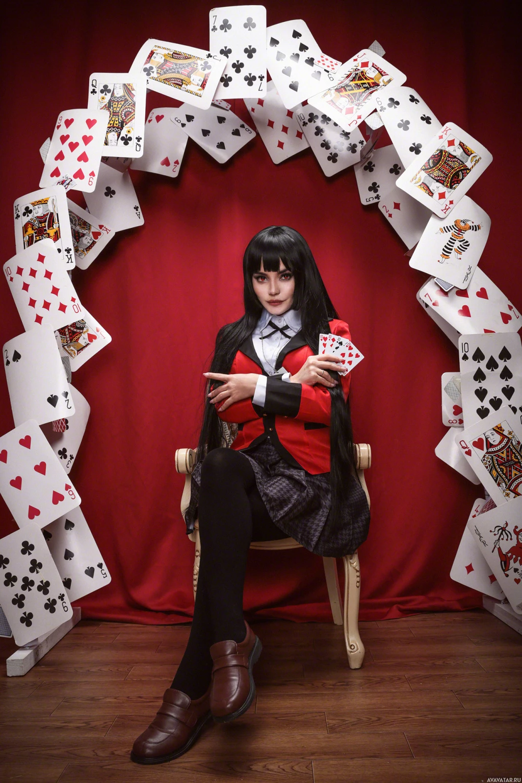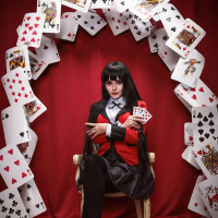 The picture features a person dressed in what appears to be anime-style attire, sitting on a chair and surrounded by playing cards. The individual has