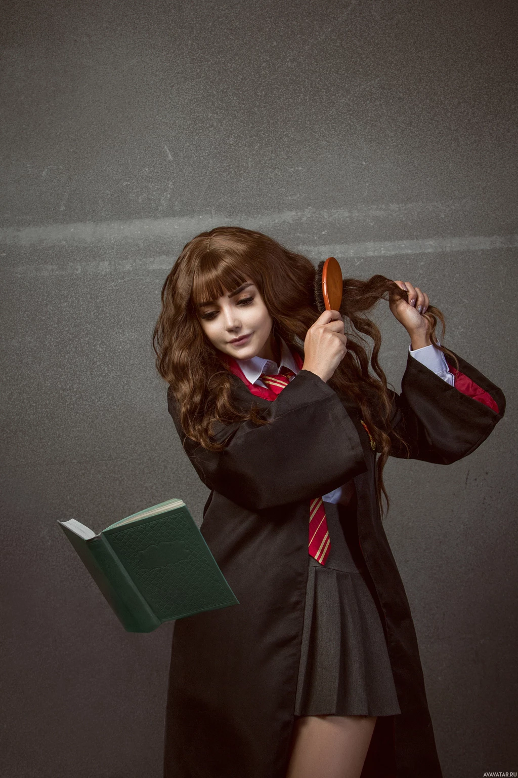 a school uniform associated with Hogwarts School, which includes a black robe with Gryffindor house colors on it, a green tie, and a white shirt. The individual is holding a brush in their right hand and appears to be reading a book or performing some kind of magic-