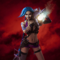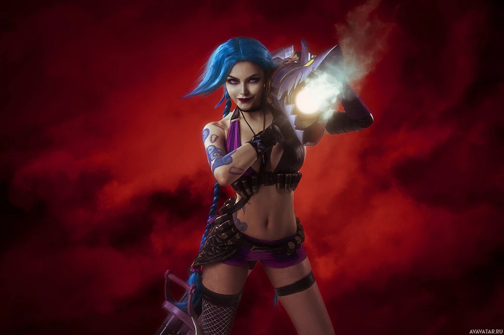 the video game "League of Legends" known as Jinx. She is portrayed in cosplay, which means someone is dressing up to look like or emulate the character from the game. Jinx is known for her playful and mischievous personality within the game's universe. The background has a dramatic