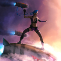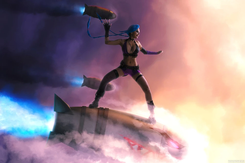 League of Legends." She is shown in a cosplay pose on top of a rocket, which aligns with her theme and abilities as