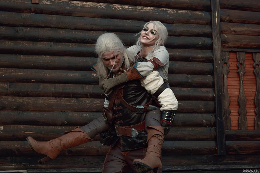 the video game "The Witcher 3: Wild Hunt". On the left, there is a character wearing armor and holding his stomach with one hand, possibly indicating injury or discomfort. To the right, another character, who appears to be female, has her arms wrapped around