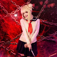 blonde hair and is wearing a school uniform with a tie and a red scarf around her neck, which are commonly associated with anime or manga character designs. The background features