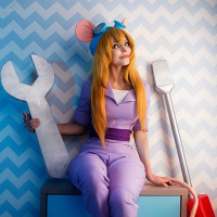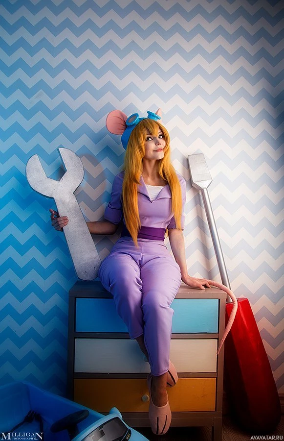 The image depicts a person dressed in an outfit that resembles the character Gadget Hackwrench from the "Chip 'n Dale: Rescue Rangers"