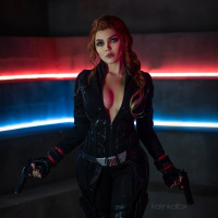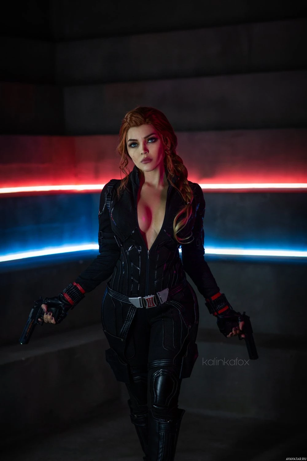 Widow costume. In their hand, they hold a pistol, indicating that they might be in a scene depicting action or espionage. The background has a red, white, and blue color scheme, possibly hinting at an American theme or context for this