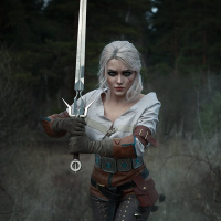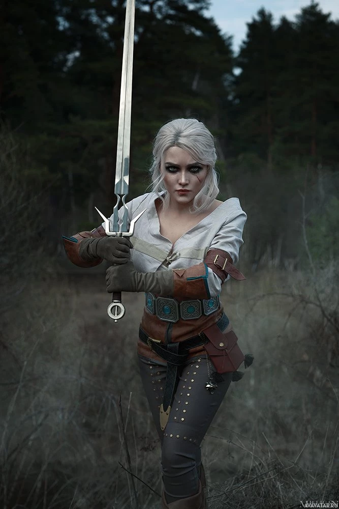 the video game "The Witcher" series. She is depicted as Ciri, holding a sword and dressed in attire that suggests a fantasy or