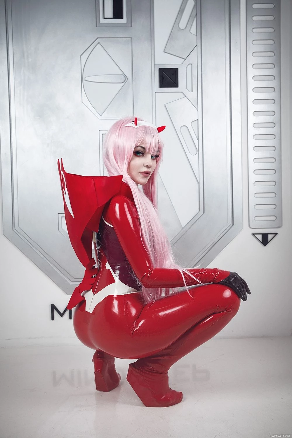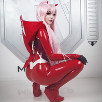 an animated character, with pink hair and a red outfit featuring wings on the back. The setting seems to be a themed environment, possibly designed for a photoshoot or event related to the character being cosplayed.