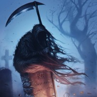 the Grim Reaper, a personification of death. In front of this figure is a headstone bearing the inscription "Rest in Peace," which is a phrase often used at funerals or graves. The setting appears to be an outdoor location during evening or nighttime due to