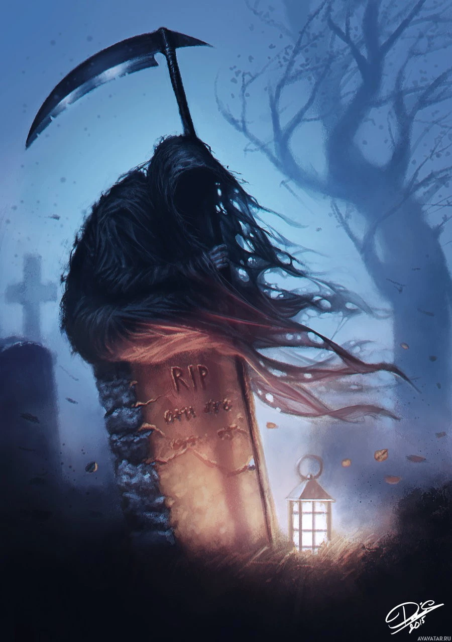 a hooded cloak, holding a large scythe over their shoulder. This figure is commonly associated with