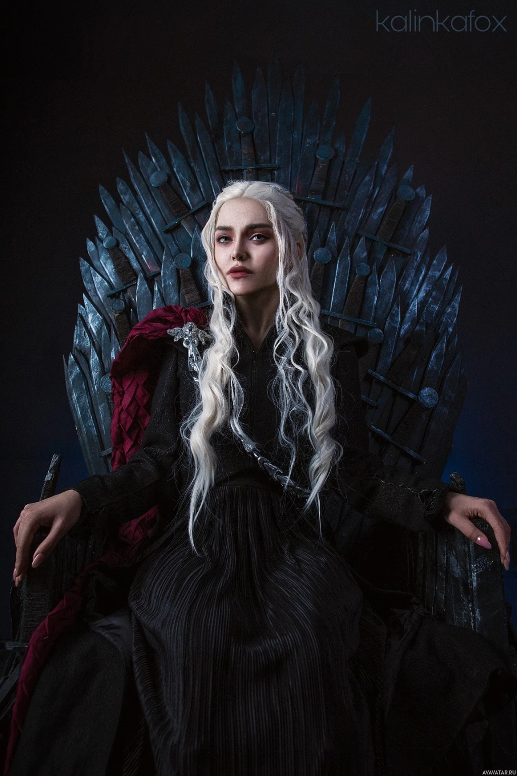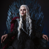 flowing hair and a cape, seated on what appears to be a replica of the Iron Throne from the series, which is an iconic symbol associated with power in the fictional world of Westeros.