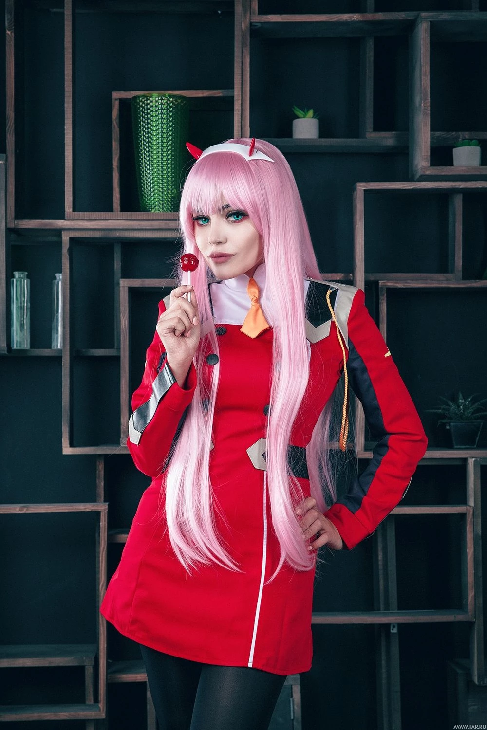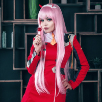 hair bow and glasses. In this cosplay, the person has styled their hair in two ponytails on either side of the head to mimic Pink Hair's