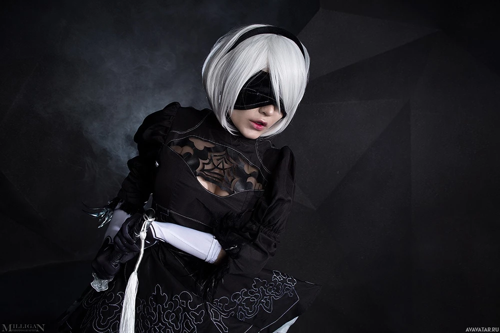 the video game "Nier: Automata." The cosplayer is wearing a dark-colored outfit with intricate lace and ribbons, which suggests a gothic or steampunk design. The setting has an industrial or futuristic look, fitting the theme of the game where technology and humanity intersect in