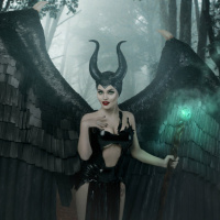 The image features a person dressed in cosplay as Maleficent, a character from the Disney movie "Sleeping Beauty." The individual is wearing