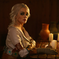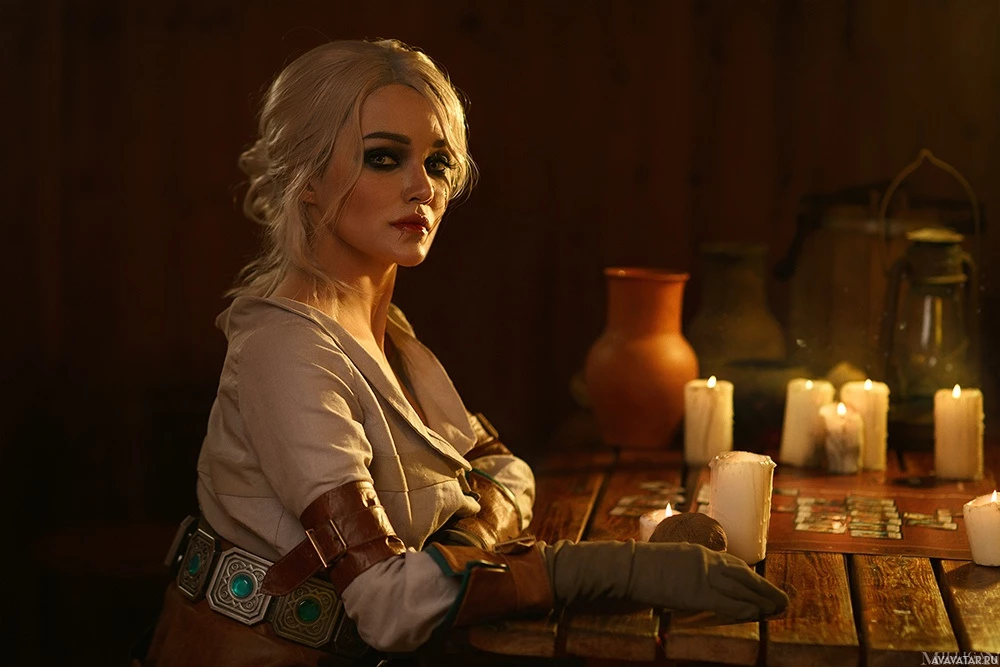 the video game "The Witcher 3: Wild Hunt". She is depicted in costume and makeup consistent with her appearance in the game, sitting at what appears to be