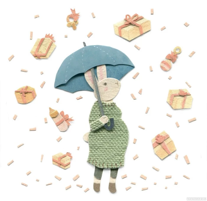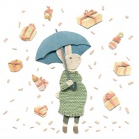 rabbit character holding a blue umbrella. The rabbit is wearing a green dress and has small pink ears and a cute