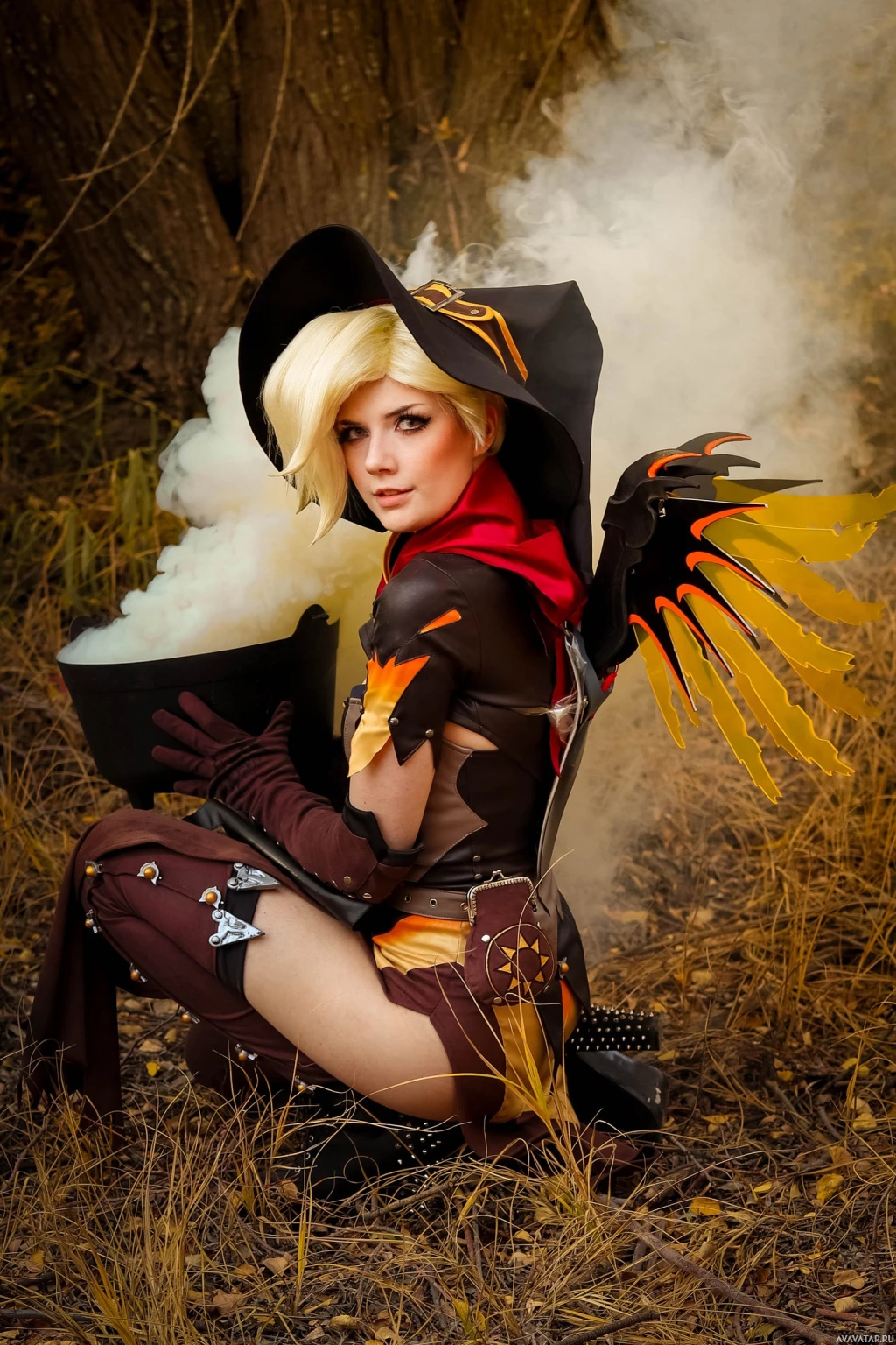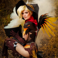 The image depicts a person cosplaying as Mercy from