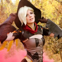 The image features a person dressed in cosplay attire that resembles the character Mercy from