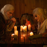 the video game "The Witcher 3: Wild Hunt." They are sitting at a table with