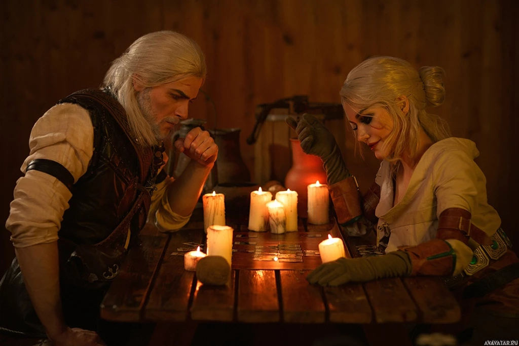 The image shows two individuals dressed in costumes that resemble the characters Ciri and Geralt of Rivia from