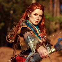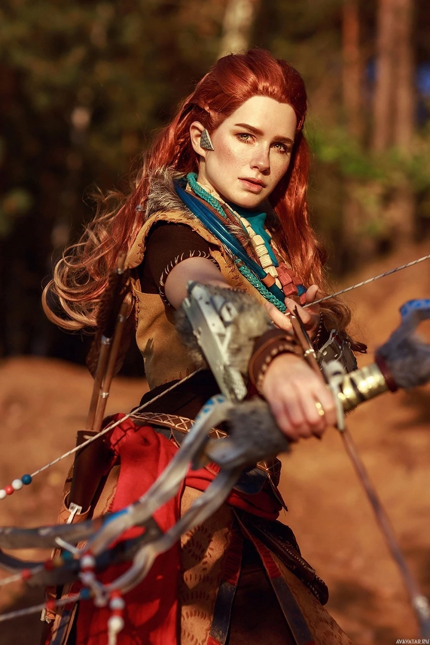 The image features a person dressed in cosplay attire resembling the character Aloy from