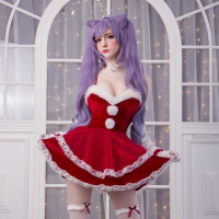 purple hair and are wearing a red dress with white trim, including ruffles around the neckline and sleeves. The individual is standing in front of what appears to be a Christmas-themed setting, possibly decorated for