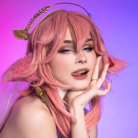 The image features a person dressed as Yae Miko, a popular character from the game "