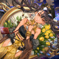 black hair, wearing elaborate and ornate jewelry, including large golden earrings. Her attire includes what seems to be a skirt or dress made from gold fabric, complemented by