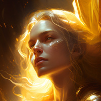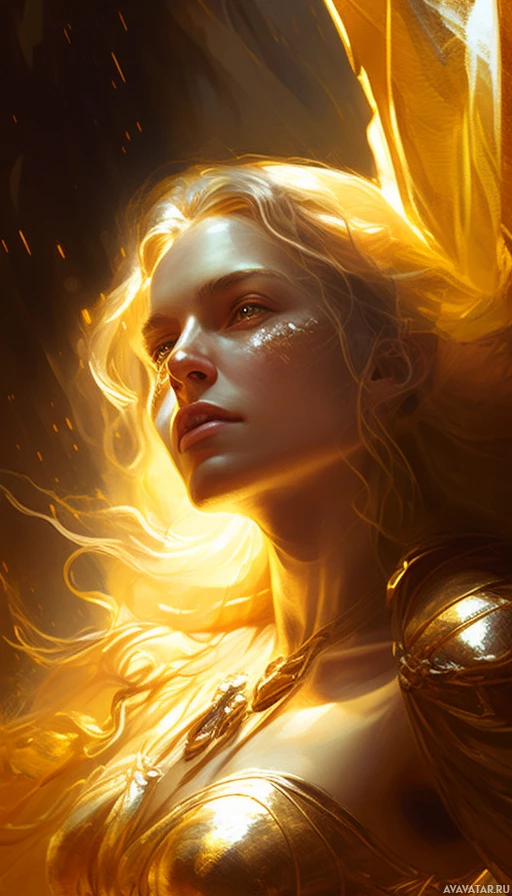 a female figure with golden hair and striking eyes. She has an ethereal or magical appearance, possibly hinting at fantasy elements in the story she is from. Her expression is thoughtful, suggesting she could be a protagonist or