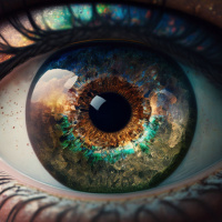 a human eye. Within the eye, there appears to be a landscape or scenery depicted, which is an artistic representation and not
