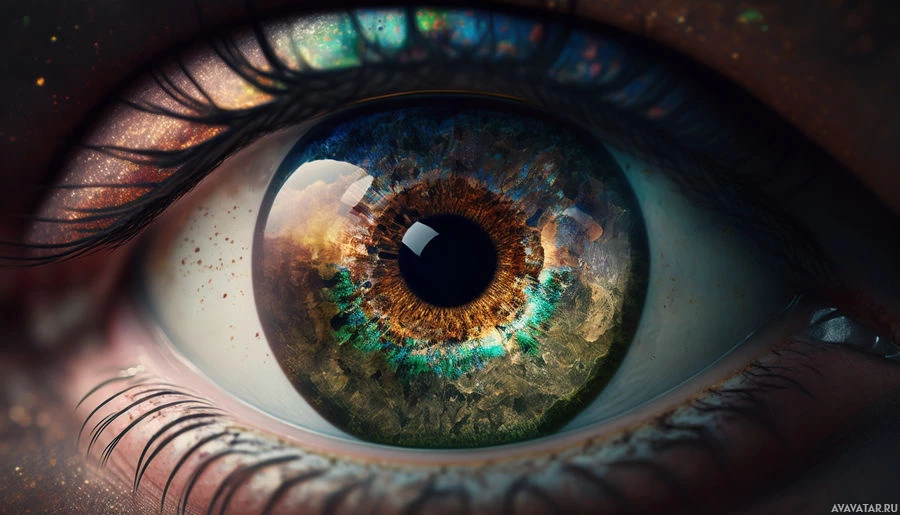 bioluminescent organisms that are seen as a reflection within the eye, giving the illusion that the iris is a window into another world or scene. The colors and details suggest a fantastical or surreal setting rather than a typical human