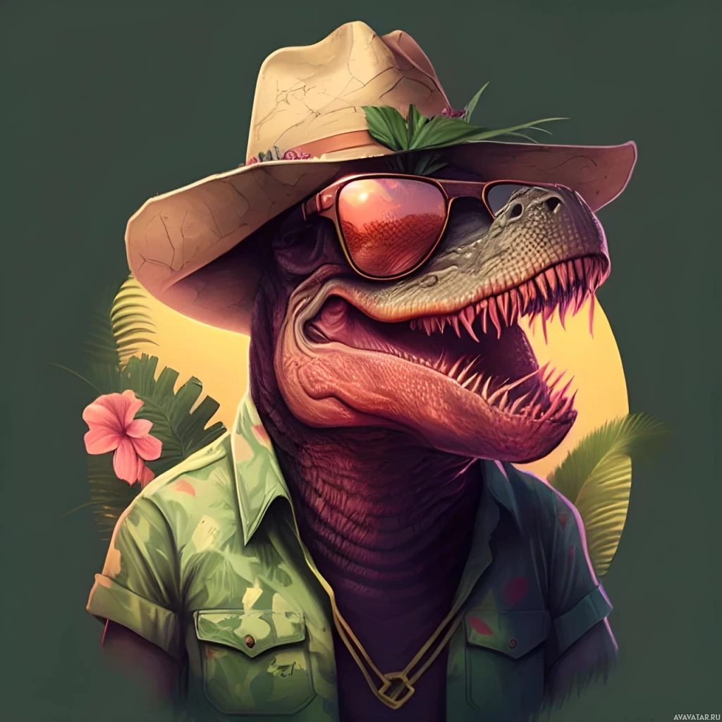 The image features a stylized illustration of an animal that resembles a dinosaur, specifically a Velociraptor, standing upright and wearing sunglasses with a retro style frame. The creature is also donning a fedora-style hat and what appears to be