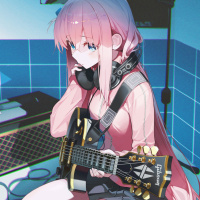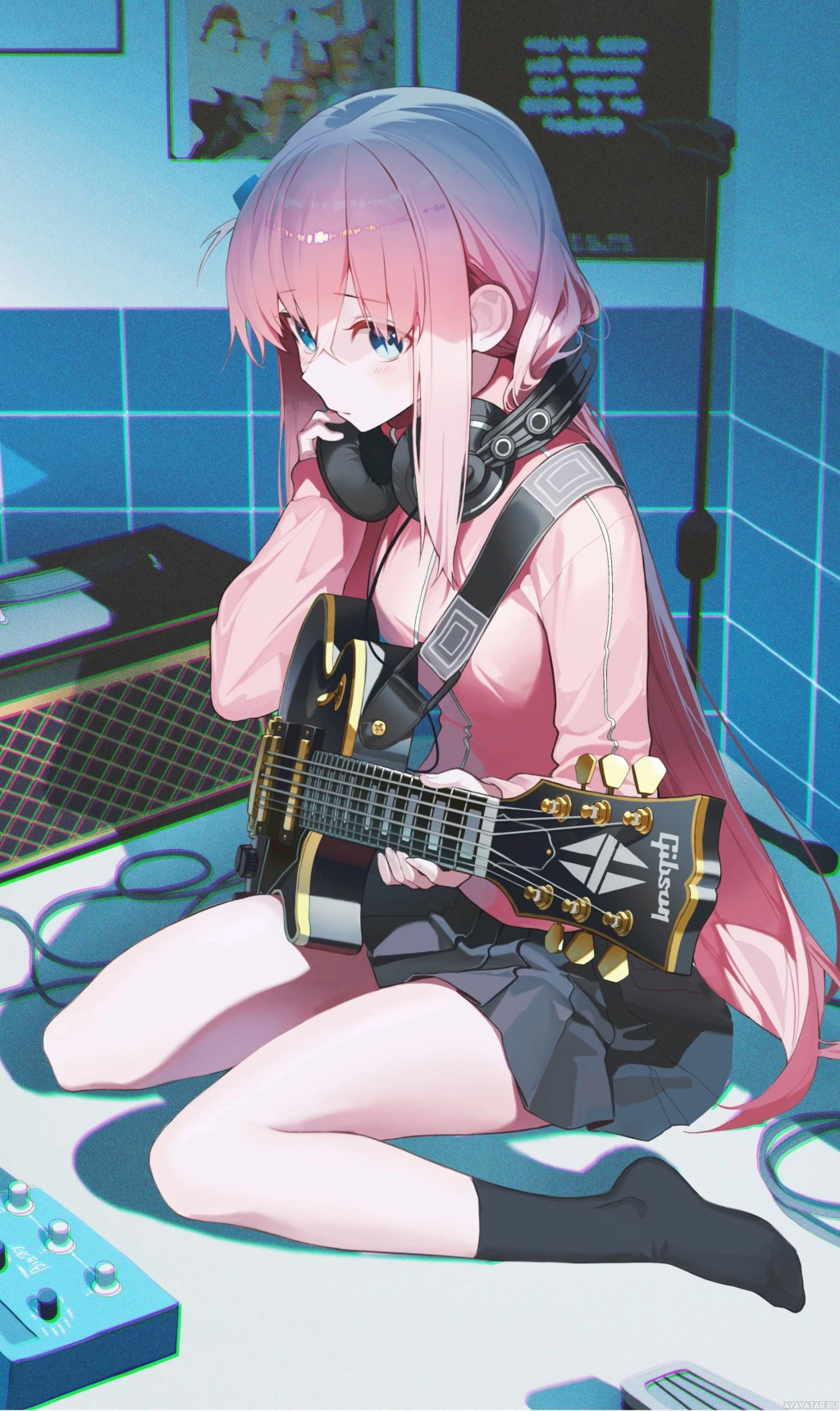 На картинке изображен анимационный персонаж с розовыми волосами, с черными наушниками на шее и электрогитарой в руках. Она сидит на полу перед чем-то, что, по-видимому, является звукозаписывающим оборудованием, возможно, микшерным пультом или декой. Обстановка похожа на небольшую домашнюю студию или личное музыкальное пространство.