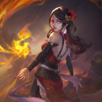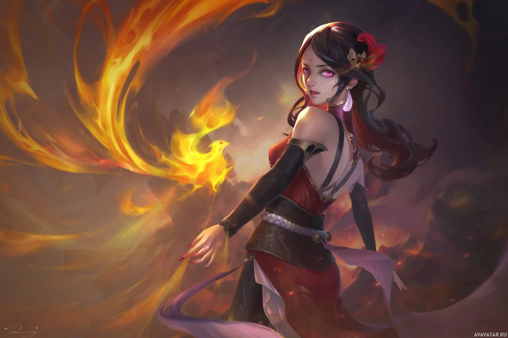 a role in battle or adventure. There are elements associated with fire around her, such as flames and embers, which adds to the dramatic and intense atmosphere of the image. The overall composition conveys a sense of motion and energy, and it's likely that this character is known for her association with fire or