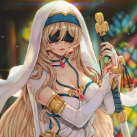 blonde hair. She is depicted in a fantasy-themed setting and is wearing a dress that suggests a warrior or mage archetype, with elements like a veil, boots, and
