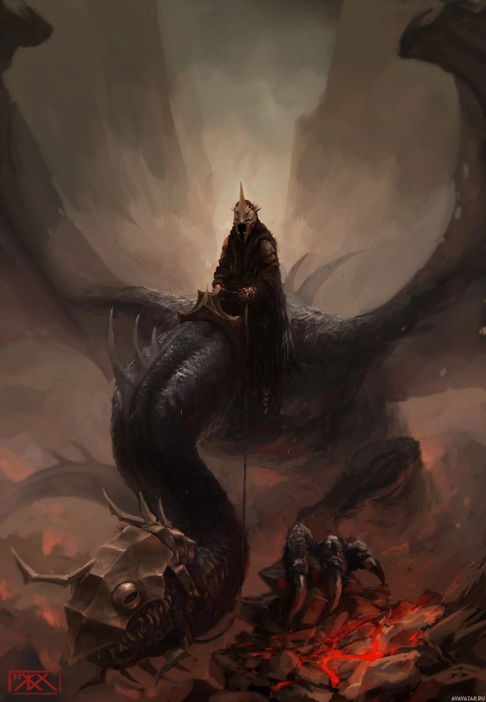 winged dragon-like creature, which could be interpreted as a representation of a Nazgul from Middle-earth, given the association with the Lord of the Rings series. The figure is holding what appears to be a staff or scepter and is wearing armor, suggesting a role of authority or power within this