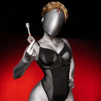 a cigarette holder or similar prop in their hand, which complements the style of the character they are portraying. The background is dark red, giving off