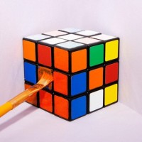 puzzle cube made up of smaller colored cubes. It is being cleaned by a yellow brush. The Rubik's Cube is typically used for solving puzzles or as