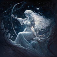 mythical being. She is holding a bow with grace and poise. The background features a starlit