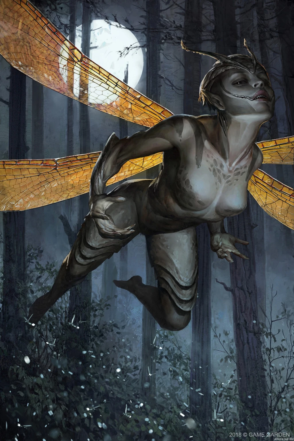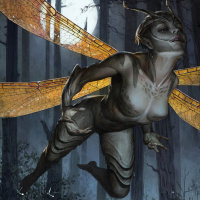 This is a digital artwork featuring a fantasy-themed character. The image shows the figure of a woman with wings and insect-like features, such as an exoskeleton, in what appears to be a forest setting under