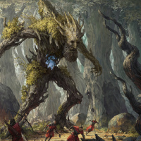 a fantasy scene featuring a large, menacing tree-like creature at the center. This creature has