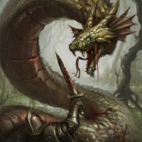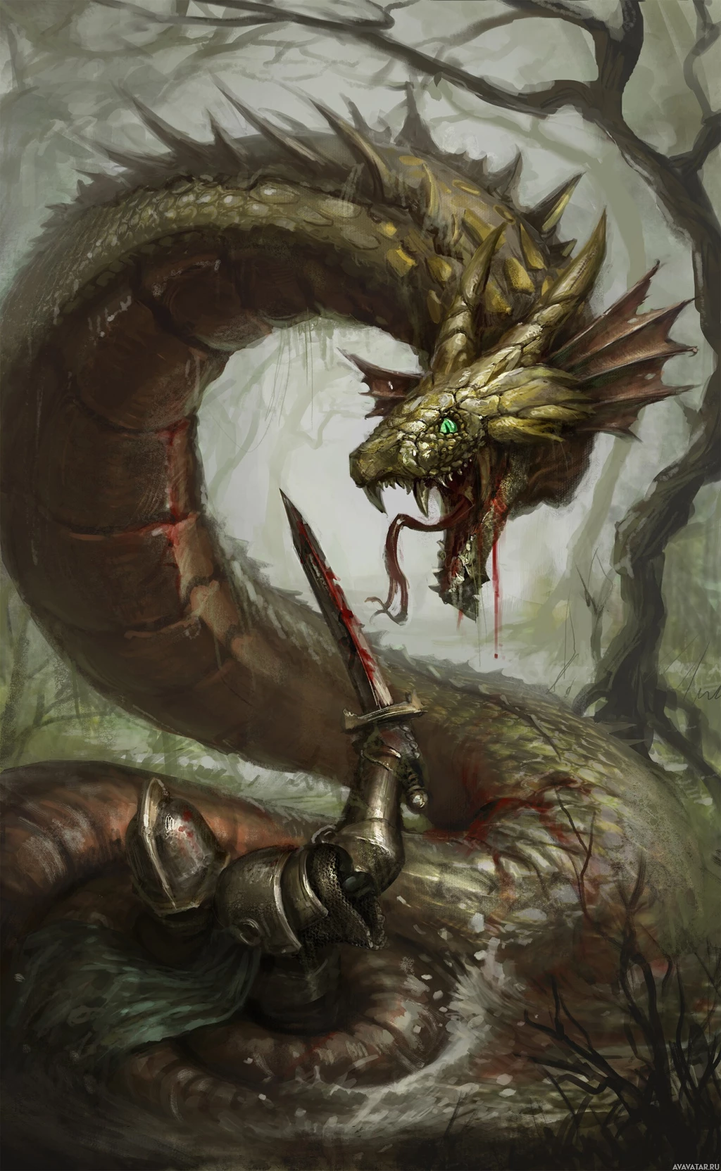 На картинке изображена фантастическая сцена с двумя змеями, одна из которых, большая и угрожающая, нападает на змею поменьше, которая защищается. На переднем плане также изображен воин, на которого напала змея покрупнее, и у него на туловище течет кровь из раны. Действие происходит в лесу или редколесье с деревьями и туманом, что создает мистическую атмосферу сцены.